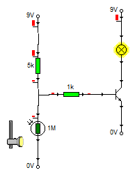 Cuando la luz disminuye, la resistencia de la LDR aumenta (puede llegar a valer varios cientos de KΏ) por lo que la caída de tensión en la LDR aumenta lo suficiente para que la tensión en la base sea mayor de 0´7 v y llegue corriente a la base del transistor, conduzca y se encienda el diodo LED.